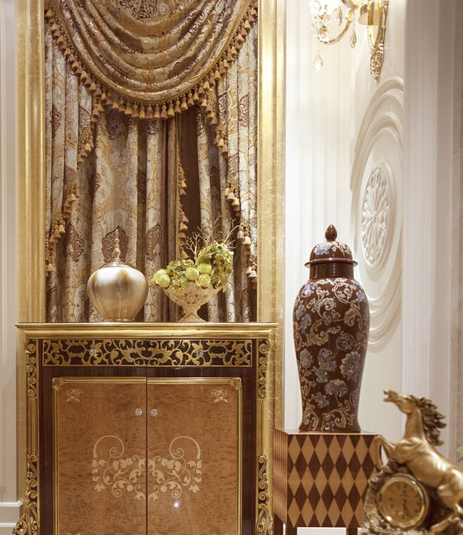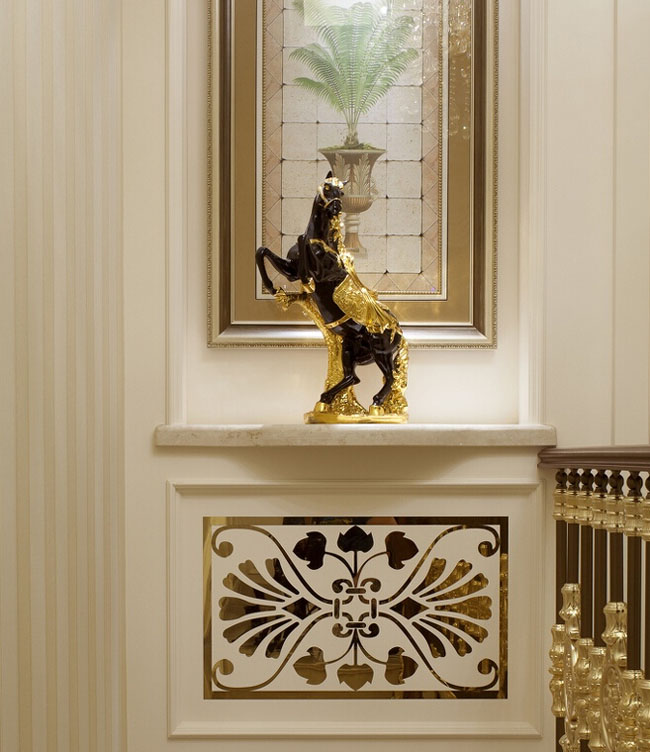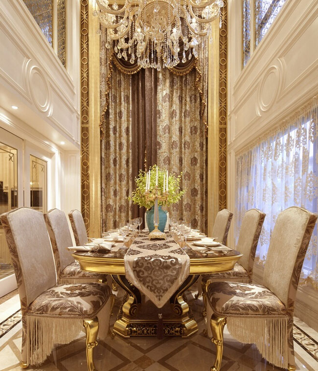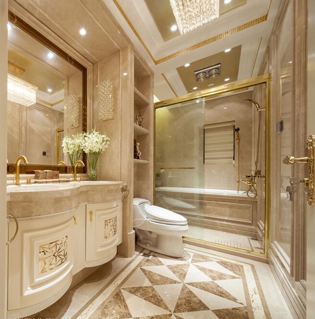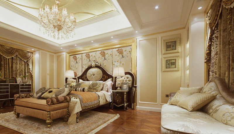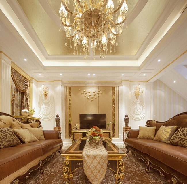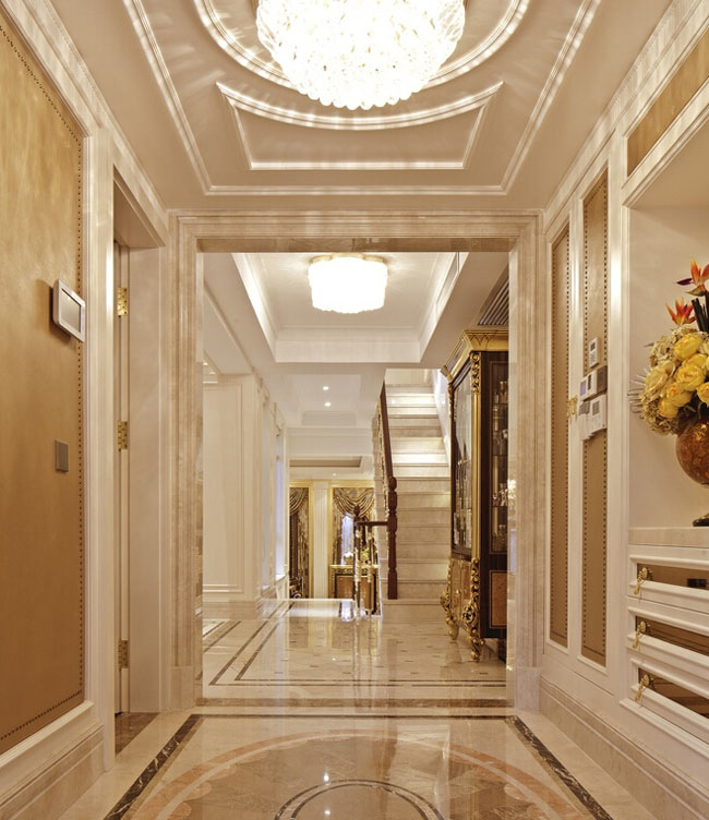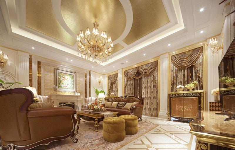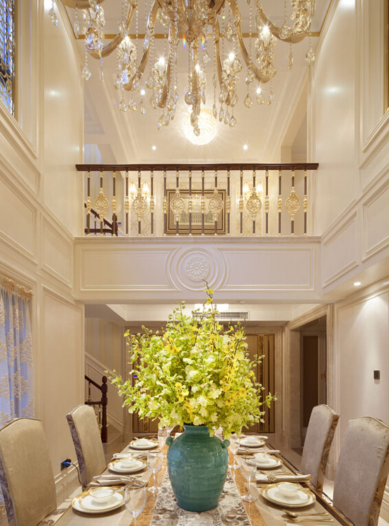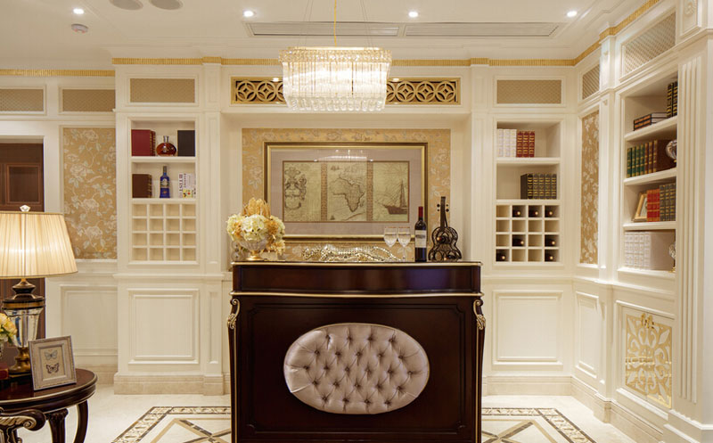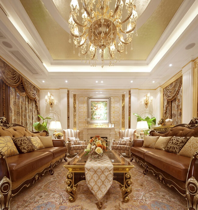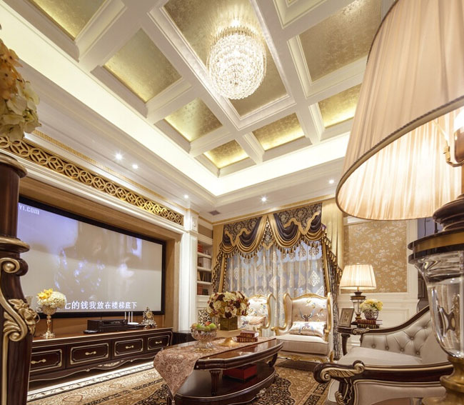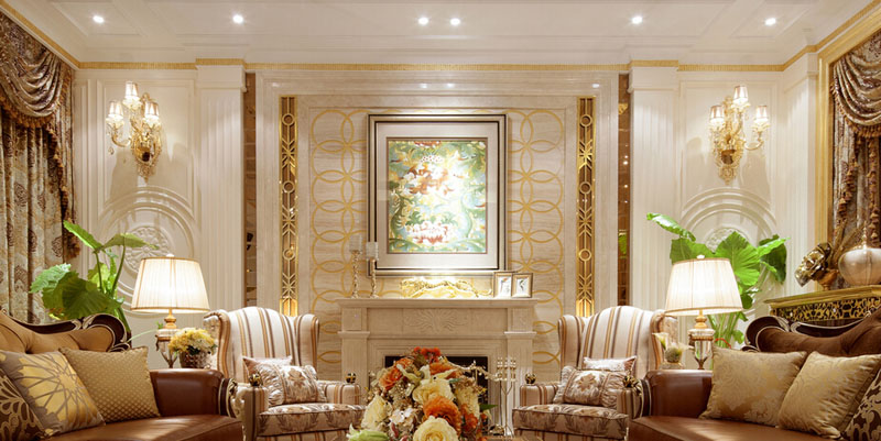 今天大家看到的这套遂宁别墅装修设计-500平米欧式别墅装修设计-案例是由专业别墅装修设计公司里林设计工作室整理提供。本案设计面积500平米,包括地下室,一层,二层。由于房型南北狭长,采光不是十分理想,设计采用淡雅的欧式元素,一层公共空间大面积采用象牙色护墙并以香槟金色线条点缀。用爵士白大理石设计门套及壁炉,充分利用原有的尖屋顶巧妙设计出三层跌级吊顶,在凸显品质的同时让空间感觉更开敞明快,软装上选用美式的深色家具搭配蓝色天鹅绒窗帘,让空间更沉稳,色彩更协调。希望大家喜欢!